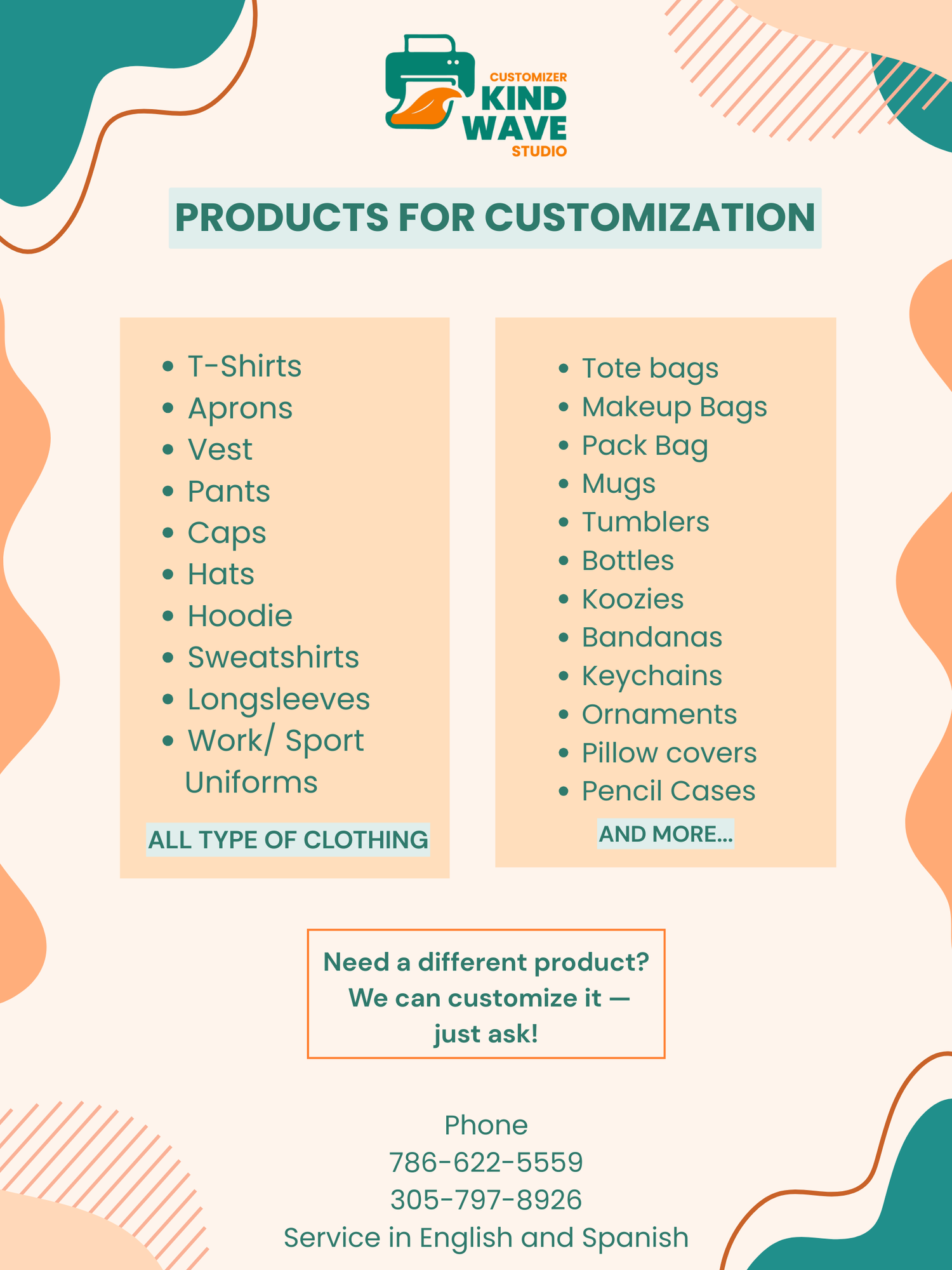 We create fully customized designs on all these products — and many more. Using high-quality methods like DTF and sublimation, we bring your ideas, logos, and styles to life on apparel, accessories, and home items. If you can imagine it, we can make it!